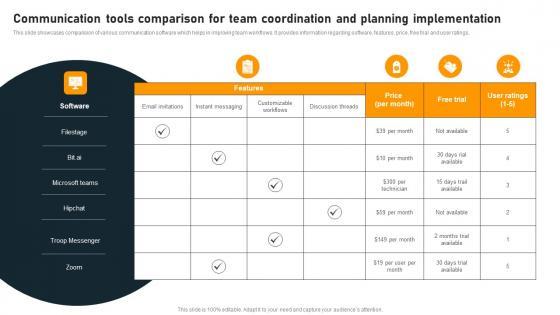 This slide showcases comparision of various communication software which helps in improving team workflows. It provides information regarding software, features, price, free trial and user ratings. Showcasing this set of slides titled Communication Tools Comparison For Team Coordination And Planning Implementation Slides Pdf. The topics addressed in these templates are Discussion Threads, Customizable Workflows, Instant Messaging. All the content presented in this PPT design is completely editable. Download it and make adjustments in color, background, font etc. as per your unique business setting. This slide showcases comparision of various communication software which helps in improving team workflows. It provides information regarding software, features, price, free trial and user ratings.