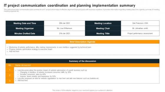This slide showcases communication plan summary for an IT project which helps in effective alignment of project goals with business objectives. It provides information regarding meeting date, time, agenda, summary of meeting, meeting organizer etc. Showcasing this set of slides titled IT Project Communication Coordination And Planning Implementation Summary Demonstration Pdf. The topics addressed in these templates are Changing Interface Website, Increase Conversion Rates, Improve Brand Visibility Awareness. All the content presented in this PPT design is completely editable. Download it and make adjustments in color, background, font etc. as per your unique business setting. This slide showcases communication plan summary for an IT project which helps in effective alignment of project goals with business objectives. It provides information regarding meeting date, time, agenda, summary of meeting, meeting organizer etc.