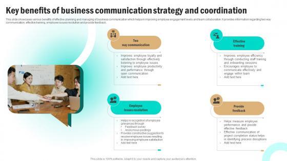 This slide showcases various benefits of effective planning and managing of business communication which helps in improving employee engagement levels and team collaboration. It provides information regarding two way communication, effective training, employee issues resolution and provide feedback. Pitch your topic with ease and precision using this Key Benefits Of Business Communication Strategy And Coordination Designs Pdf. This layout presents information on Communication, Effective Training, Employee Issues. It is also available for immediate download and adjustment. So, changes can be made in the color, design, graphics or any other component to create a unique layout. This slide showcases various benefits of effective planning and managing of business communication which helps in improving employee engagement levels and team collaboration. It provides information regarding two way communication, effective training, employee issues resolution and provide feedback.
