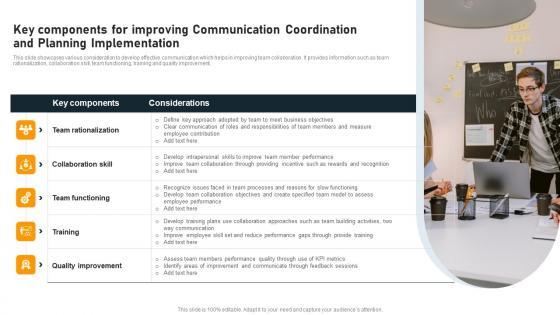 This slide showcases various consideration to develop effective communication which helps in improving team collaboration. It provides information such as team rationalization, collaboration skill, team functioning, training and quality improvement. Showcasing this set of slides titled Key Components For Improving Communication Coordination And Planning Implementation Designs Pdf. The topics addressed in these templates are Collaboration Skill, Team Functioning, Team Rationalization. All the content presented in this PPT design is completely editable. Download it and make adjustments in color, background, font etc. as per your unique business setting. This slide showcases various consideration to develop effective communication which helps in improving team collaboration. It provides information such as team rationalization, collaboration skill, team functioning, training and quality improvement.