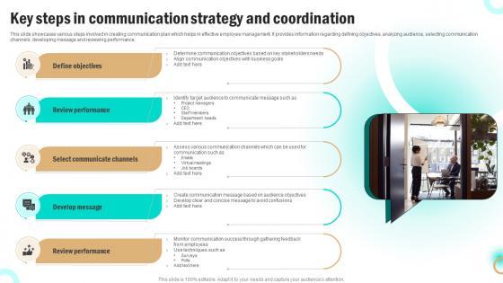 This slide showcases various steps involved in creating communication plan which helps in effective employee management. It provides information regarding defining objectives, analyzing audience, selecting communication channels, developing message and reviewing performance. Showcasing this set of slides titled Key Steps In Communication Strategy And Coordination Diagrams Pdf. The topics addressed in these templates are Objectives, Analyzing Audience, Selecting Communication Channels, Developing Message. All the content presented in this PPT design is completely editable. Download it and make adjustments in color, background, font etc. as per your unique business setting. This slide showcases various steps involved in creating communication plan which helps in effective employee management. It provides information regarding defining objectives, analyzing audience, selecting communication channels, developing message and reviewing performance.