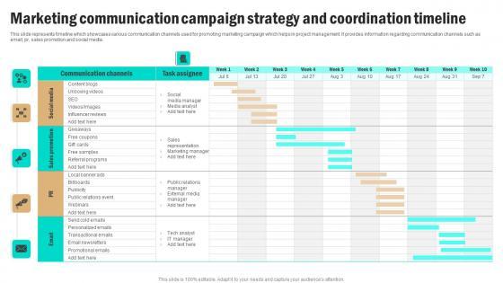 This slide represents timeline which showcases various communication channels used for promoting marketing campaign which helps in project management. It provides information regarding communication channels such as email, pr, sales promotion and social media. Pitch your topic with ease and precision using this Marketing Communication Campaign Strategy And Coordination Timeline Download Pdf. This layout presents information on Communication Channels, Email, PR, Sales Promotion. It is also available for immediate download and adjustment. So, changes can be made in the color, design, graphics or any other component to create a unique layout. This slide represents timeline which showcases various communication channels used for promoting marketing campaign which helps in project management. It provides information regarding communication channels such as email, pr, sales promotion and social media.