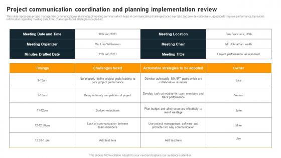 This slide represents project management communication plan minutes of meeting summary which helps in communicating challenges faced in project and provide corrective suggestion to improve performance. It provides information regarding meeting date, time, challenges faced, strategies adopted etc. Pitch your topic with ease and precision using this Project Communication Coordination And Planning Implementation Review Portrait Pdf. This layout presents information on Not Properly Define Project, Goals Leading Poor, Project Performance. It is also available for immediate download and adjustment. So, changes can be made in the color, design, graphics or any other component to create a unique layout. This slide represents project management communication plan minutes of meeting summary which helps in communicating challenges faced in project and provide corrective suggestion to improve performance. It provides information regarding meeting date, time, challenges faced, strategies adopted etc.
