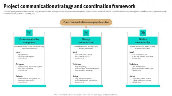 This slide highlights framework for effective project communication management which helps in improve employee performance and business revenue. It provides information regarding plan communication management, manage communication and monitor communication. Pitch your topic with ease and precision using this Project Communication Strategy And Coordination Framework Clipart Pdf. This layout presents information on Regarding Plan, Communication Management, Manage Communication. It is also available for immediate download and adjustment. So, changes can be made in the color, design, graphics or any other component to create a unique layout. This slide highlights framework for effective project communication management which helps in improve employee performance and business revenue. It provides information regarding plan communication management, manage communication and monitor communication.