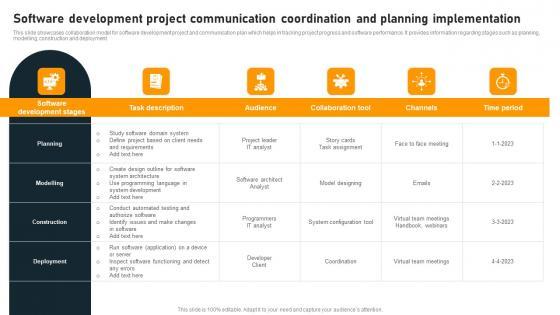 This slide showcases collaboration model for software development project and communication plan which helps in tracking project progress and software performance. It provides information regarding stages such as planning, modelling, construction and deployment. Showcasing this set of slides titled Software Development Project Communication Coordination And Planning Implementation Clipart Pdf. The topics addressed in these templates are Planning, Modelling, Construction. All the content presented in this PPT design is completely editable. Download it and make adjustments in color, background, font etc. as per your unique business setting. This slide showcases collaboration model for software development project and communication plan which helps in tracking project progress and software performance. It provides information regarding stages such as planning, modelling, construction and deployment.
