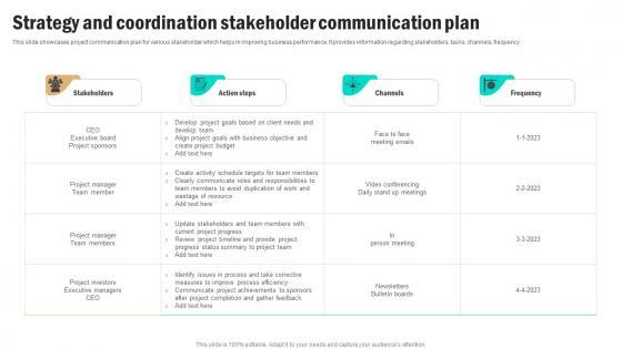 This slide showcases project communication plan for various stakeholder which helps in improving business performance. It provides information regarding stakeholders, tasks, channels, frequency. Pitch your topic with ease and precision using this Strategy And Coordination Stakeholder Communication Plan Themes Pdf. This layout presents information on Stakeholders, Action Steps, Channels, Frequency. It is also available for immediate download and adjustment. So, changes can be made in the color, design, graphics or any other component to create a unique layout. This slide showcases project communication plan for various stakeholder which helps in improving business performance. It provides information regarding stakeholders, tasks, channels, frequency.