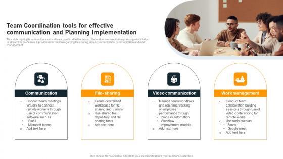 This slide highlights various tools and software used in effective team collaboration communication planning which helps in streamline processes. It provides information regarding file sharing, video communication, communication and work management. Pitch your topic with ease and precision using this Team Coordination Tools For Effective Communication And Planning Implementation Sample Pdf. This layout presents information on Communication, Video Communication, Work Management. It is also available for immediate download and adjustment. So, changes can be made in the color, design, graphics or any other component to create a unique layout. This slide highlights various tools and software used in effective team collaboration communication planning which helps in streamline processes. It provides information regarding file sharing, video communication, communication and work management.