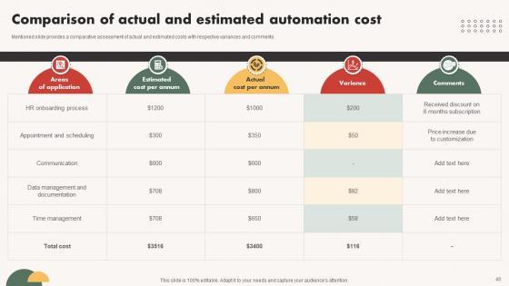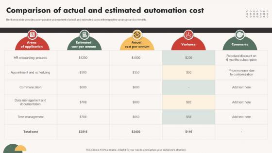 Mentioned slide provides a comparative assessment of actual and estimated costs with respective variances and comments. If your project calls for a presentation, then Slidegeeks is your go-to partner because we have professionally designed, easy-to-edit templates that are perfect for any presentation. After downloading, you can easily edit Automated Communication System Comparison Of Actual And Estimated Automation and make the changes accordingly. You can rearrange slides or fill them with different images. Check out all the handy templates Mentioned slide provides a comparative assessment of actual and estimated costs with respective variances and comments.