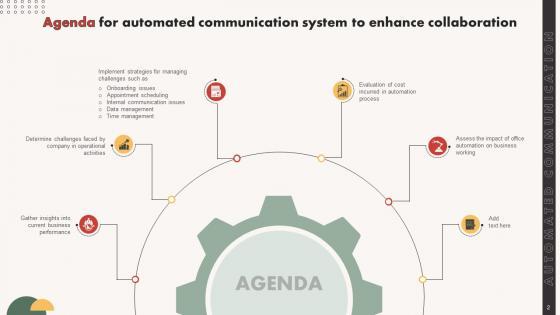 Create an editable Agenda For Automated Communication System To Enhance Collaboration that communicates your idea and engages your audience. Whether you are presenting a business or an educational presentation, pre-designed presentation templates help save time. Agenda For Automated Communication System To Enhance Collaboration is highly customizable and very easy to edit, covering many different styles from creative to business presentations. Slidegeeks has creative team members who have crafted amazing templates. So, go and get them without any delay. Our Agenda For Automated Communication System To Enhance Collaboration are topically designed to provide an attractive backdrop to any subject. Use them to look like a presentation pro.