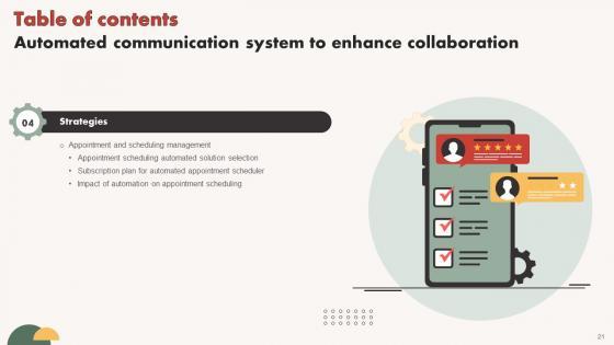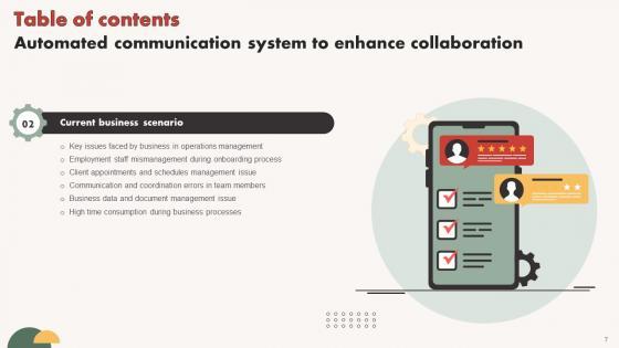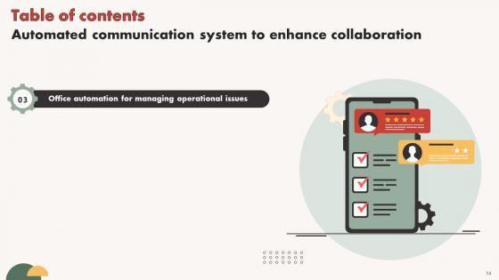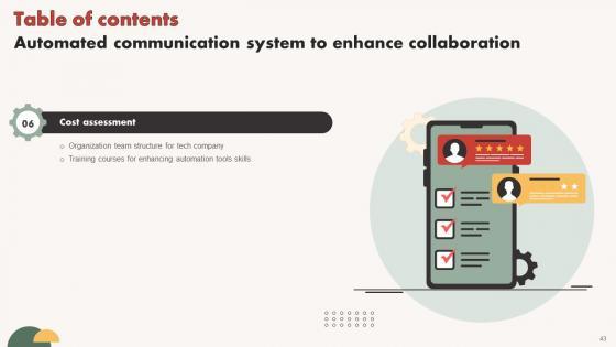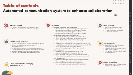 Boost your pitch with our creative Table Of Contents Automated Communication System To Enhance Collaboration. Deliver an awe-inspiring pitch that will mesmerize everyone. Using these presentation templates you will surely catch everyones attention. You can browse the ppts collection on our website. We have researchers who are experts at creating the right content for the templates. So you do not have to invest time in any additional work. Just grab the template now and use them. Our Table Of Contents Automated Communication System To Enhance Collaboration are topically designed to provide an attractive backdrop to any subject. Use them to look like a presentation pro.