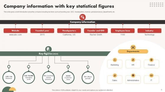 This slide gives a brief introduction about the company including key facts such as founding year, CEO, headquarters, revenue, global presence, departments, etc. Whether you have daily or monthly meetings, a brilliant presentation is necessary. Automated Communication System Company Information With Key Statistical Figures can be your best option for delivering a presentation. Represent everything in detail using Automated Communication System Company Information With Key Statistical Figures and make yourself stand out in meetings. The template is versatile and follows a structure that will cater to your requirements. All the templates prepared by Slidegeeks are easy to download and edit. Our research experts have taken care of the corporate themes as well. So, give it a try and see the results. This slide gives a brief introduction about the company including key facts such as founding year, CEO, headquarters, revenue, global presence, departments, etc.