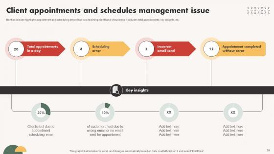 Mentioned slide highlights appointment and scheduling errors lead to a declining client base of business. It includes total appointments, key insights, etc. Slidegeeks is here to make your presentations a breeze with Automated Communication System Client Appointments And Schedules Management With our easy-to-use and customizable templates, you can focus on delivering your ideas rather than worrying about formatting. With a variety of designs to choose from, you are sure to find one that suits your needs. And with animations and unique photos, illustrations, and fonts, you can make your presentation pop. So whether you are giving a sales pitch or presenting to the board, make sure to check out Slidegeeks first Mentioned slide highlights appointment and scheduling errors lead to a declining client base of business. It includes total appointments, key insights, etc.