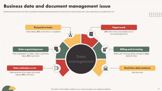 Mentioned slide provides information about data management challenges faced by company such as data collection error, data organising issue, repetitive tasks, etc. Present like a pro with Automated Communication System Business Data And Document Management Issue. Create beautiful presentations together with your team, using our easy-to-use presentation slides. Share your ideas in real-time and make changes on the fly by downloading our templates. So whether you are in the office, on the go, or in a remote location, you can stay in sync with your team and present your ideas with confidence. With Slidegeeks presentation got a whole lot easier. Grab these presentations today. Mentioned slide provides information about data management challenges faced by company such as data collection error, data organising issue, repetitive tasks, etc.
