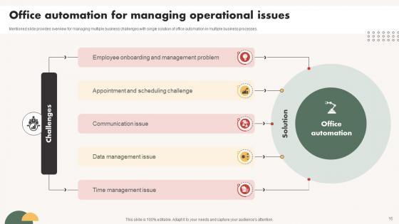 Mentioned slide provides overview for managing multiple business challenges with single solution of office automation in multiple business processes. This modern and well-arranged Automated Communication System Office Automation For Managing Operational provides lots of creative possibilities. It is very simple to customize and edit with the Powerpoint Software. Just drag and drop your pictures into the shapes. All facets of this template can be edited with Powerpoint, no extra software is necessary. Add your own material, put your images in the places assigned for them, adjust the colors, and then you can show your slides to the world, with an animated slide included. Mentioned slide provides overview for managing multiple business challenges with single solution of office automation in multiple business processes.