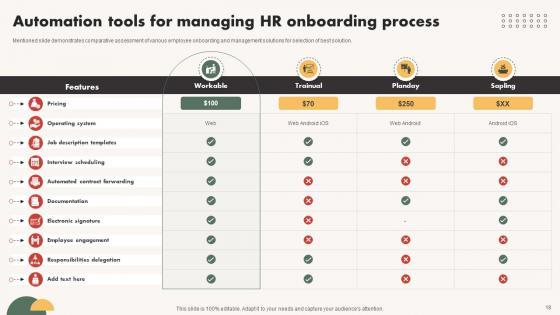 Mentioned slide demonstrates comparative assessment of various employee onboarding and management solutions for selection of best solution. Get a simple yet stunning designed Automated Communication System Automation Tools For Managing HR Onboarding. It is the best one to establish the tone in your meetings. It is an excellent way to make your presentations highly effective. So, download this PPT today from Slidegeeks and see the positive impacts. Our easy-to-edit Automated Communication System Automation Tools For Managing HR Onboarding can be your go-to option for all upcoming conferences and meetings. So, what are you waiting for Grab this template today. Mentioned slide demonstrates comparative assessment of various employee onboarding and management solutions for selection of best solution.