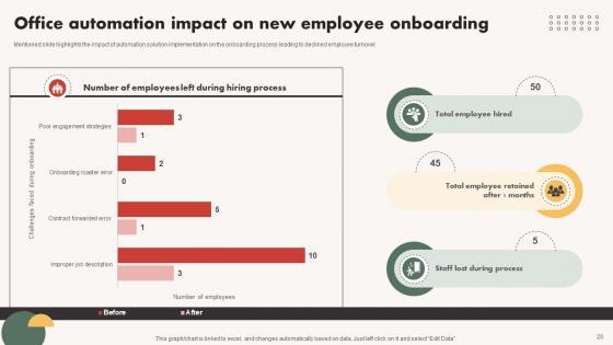 Mentioned slide highlights the impact of automation solution implementation on the onboarding process leading to declined employee turnover. Slidegeeks is one of the best resources for PowerPoint templates. You can download easily and regulate Automated Communication Office Automation Impact On New Employee Onboarding for your personal presentations from our wonderful collection. A few clicks is all it takes to discover and get the most relevant and appropriate templates. Use our Templates to add a unique zing and appeal to your presentation and meetings. All the slides are easy to edit and you can use them even for advertisement purposes. Mentioned slide highlights the impact of automation solution implementation on the onboarding process leading to declined employee turnover.