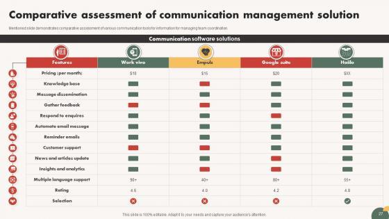 Mentioned slide demonstrates comparative assessment of various communication tools for information for managing team coordination. Find highly impressive Automated Communication System Comparative Assessment Of Communication on Slidegeeks to deliver a meaningful presentation. You can save an ample amount of time using these presentation templates. No need to worry to prepare everything from scratch because Slidegeeks experts have already done a huge research and work for you. You need to download Automated Communication System Comparative Assessment Of Communication for your upcoming presentation. All the presentation templates are 100 percent editable and you can change the color and personalize the content accordingly. Download now Mentioned slide demonstrates comparative assessment of various communication tools for information for managing team coordination.