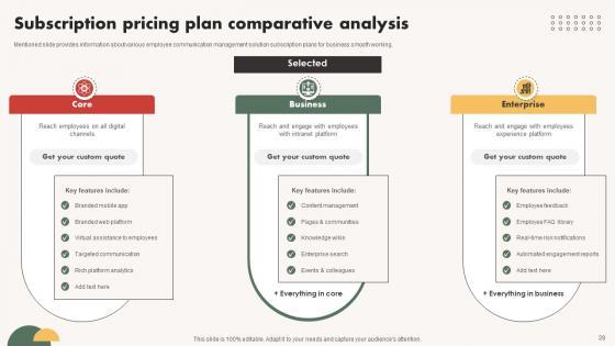 Mentioned slide provides information about various employee communication management solution subscription plans for business smooth working. Are you searching for a Automated Communication System Subscription Pricing Plan Comparative Analysis that is uncluttered, straightforward, and original Its easy to edit, and you can change the colors to suit your personal or business branding. For a presentation that expresses how much effort you have put in, this template is ideal With all of its features, including tables, diagrams, statistics, and lists, its perfect for a business plan presentation. Make your ideas more appealing with these professional slides. Download Automated Communication System Subscription Pricing Plan Comparative Analysis from Slidegeeks today. Mentioned slide provides information about various employee communication management solution subscription plans for business smooth working.