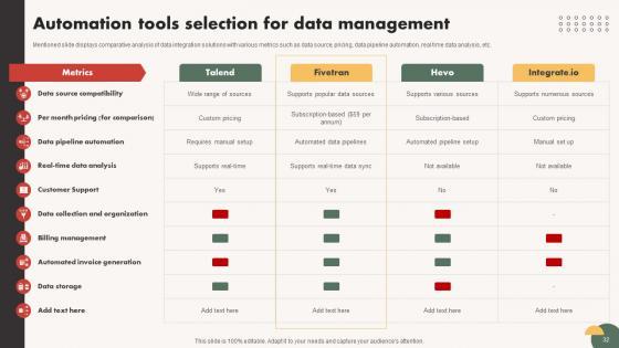Mentioned slide displays comparative analysis of data integration solutions with various metrics such as data source, pricing, data pipeline automation, real time data analysis, etc. Presenting this PowerPoint presentation, titled Automated Communication System To Automation Tools Selection For Data Management, with topics curated by our researchers after extensive research. This editable presentation is available for immediate download and provides attractive features when used. Download now and captivate your audience. Presenting this Automated Communication System To Automation Tools Selection For Data Management. Our researchers have carefully researched and created these slides with all aspects taken into consideration. This is a completely customizable Automated Communication System To Automation Tools Selection For Data Management that is available for immediate downloading. Download now and make an impact on your audience. Highlight the attractive features available with our PPTs. Mentioned slide displays comparative analysis of data integration solutions with various metrics such as data source, pricing, data pipeline automation, real time data analysis, etc.