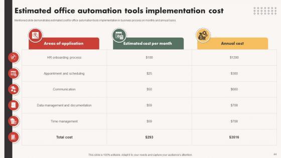 Mentioned slide demonstrates estimated cost for office automation tools implementation in business process on monthly and annual basis. Here you can discover an assortment of the finest PowerPoint and Google Slides templates. With these templates, you can create presentations for a variety of purposes while simultaneously providing your audience with an eye-catching visual experience. Download Automated Communication System To Estimated Office Automation Tools Implementation to deliver an impeccable presentation. These templates will make your job of preparing presentations much quicker, yet still, maintain a high level of quality. Slidegeeks has experienced researchers who prepare these templates and write high-quality content for you. Later on, you can personalize the content by editing the Automated Communication System To Estimated Office Automation Tools Implementation. Mentioned slide demonstrates estimated cost for office automation tools implementation in business process on monthly and annual basis.