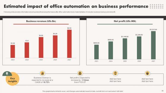 Following slide provides information about business financial performance after office automation tools implementation. It includes business revenue and net profit. Are you in need of a template that can accommodate all of your creative concepts This one is crafted professionally and can be altered to fit any style. Use it with Google Slides or PowerPoint. Include striking photographs, symbols, depictions, and other visuals. Fill, move around, or remove text boxes as desired. Test out color palettes and font mixtures. Edit and save your work, or work with colleagues. Download Automated Communication System Estimated Impact Of Office Automation On Business and observe how to make your presentation outstanding. Give an impeccable presentation to your group and make your presentation unforgettable. Following slide provides information about business financial performance after office automation tools implementation. It includes business revenue and net profit.