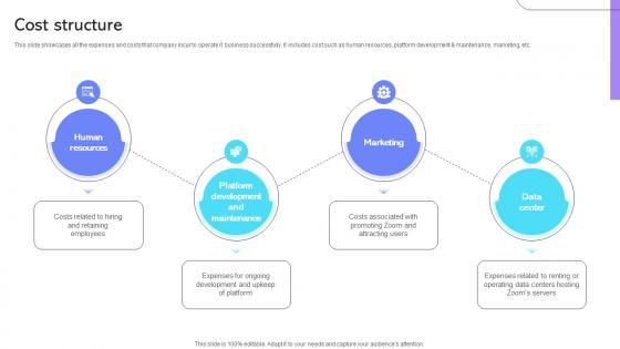 This slide showcases expenses such as research and development, sales and marketing and general and administrative. Create an editable Cost Structure Cloud Based Communication Platform Business Model BMC SS V that communicates your idea and engages your audience. Whether you are presenting a business or an educational presentation, pre-designed presentation templates help save time. Cost Structure Cloud Based Communication Platform Business Model BMC SS V is highly customizable and very easy to edit, covering many different styles from creative to business presentations. Slidegeeks has creative team members who have crafted amazing templates. So, go and get them without any delay. This slide showcases expenses such as research and development, sales and marketing and general and administrative.