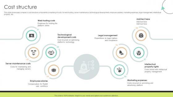 This slide showcases companys cost structure components comprising of costs for web hosting. server maintenance, technological development, employee salaries, marketing expenses, legal management, intellectual property, etc. Create an editable Cost Structure Community Networking Platform Business Model that communicates your idea and engages your audience. Whether you are presenting a business or an educational presentation, pre-designed presentation templates help save time. Cost Structure Community Networking Platform Business Model is highly customizable and very easy to edit, covering many different styles from creative to business presentations. Slidegeeks has creative team members who have crafted amazing templates. So, go and get them without any delay. This slide showcases companys cost structure components comprising of costs for web hosting. server maintenance, technological development, employee salaries, marketing expenses, legal management, intellectual property, etc.