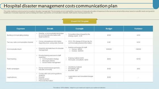 This slide mentions costs incurred by hospital in disaster management. This template aims to highlight the importance of adequate allocation of expenses to the resources and prioritize areas based on specific needs and goals for healthcare. It includes expenses such as strategy formation, payment to communication channels, staff salaries, training expenses, etc. Pitch your topic with ease and precision using this Hospital Disaster Management Costs Communication Plan Clipart Pdf. This layout presents information on Communication Team, Public Campaigns, Legal Advisory. It is also available for immediate download and adjustment. So, changes can be made in the color, design, graphics or any other component to create a unique layout. This slide mentions costs incurred by hospital in disaster management. This template aims to highlight the importance of adequate allocation of expenses to the resources and prioritize areas based on specific needs and goals for healthcare. It includes expenses such as strategy formation, payment to communication channels, staff salaries, training expenses, etc.