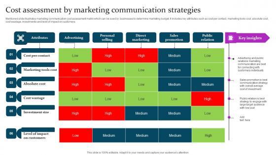 Mentioned slide illustrates marketing communication cost assessment matrix which can be sued by businesses to determine marketing budget. It includes key attributes such as cost per contact, marketing tools cost, absolute cost, cost wastage, investments and level of impact on customers. Find a pre designed and impeccable Cost Assessment By Marketing Communication Strategies Elements PDF. The templates can ace your presentation without additional effort. You can download these easy to edit presentation templates to make your presentation stand out from others. So, what are you waiting for Download the template from Slidegeeks today and give a unique touch to your presentation.