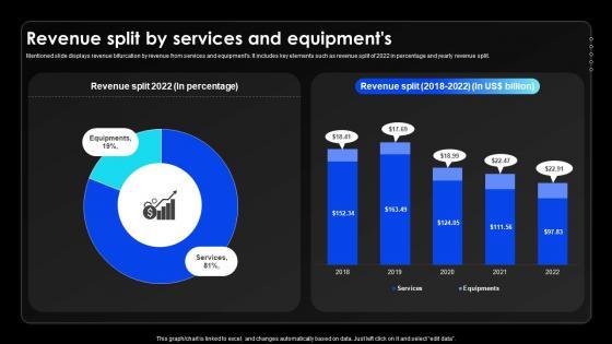 Mentioned slide displays revenue bifurcation by revenue from services and equipments. It includes key elements such as revenue split of 2022 in percentage and yearly revenue split.This Revenue Split By Services And Equipments Wireless Communication Services Provider Company Profile CP SS V from Slidegeeks makes it easy to present information on your topic with precision. It provides customization options, so you can make changes to the colors, design, graphics, or any other component to create a unique layout. It is also available for immediate download, so you can begin using it right away. Slidegeeks has done good research to ensure that you have everything you need to make your presentation stand out. Make a name out there for a brilliant performance. Mentioned slide displays revenue bifurcation by revenue from services and equipments. It includes key elements such as revenue split of 2022 in percentage and yearly revenue split.