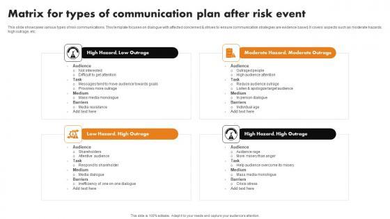 This slide showcases various types of risk communications. This template focuses on dialogue with affected concerned and strives to ensure communication strategies are evidence based. It covers aspects such as moderate hazards, high outrage, etc.Showcasing this set of slides titled Matrix For Types Of Communication Plan After Risk Event Template Pdf The topics addressed in these templates are Respond Shareholder, Media Dialogue, Mass Media Monologue All the content presented in this PPT design is completely editable. Download it and make adjustments in color, background, font etc. as per your unique business setting. This slide showcases various types of risk communications. This template focuses on dialogue with affected concerned and strives to ensure communication strategies are evidence based. It covers aspects such as moderate hazards, high outrage, etc.