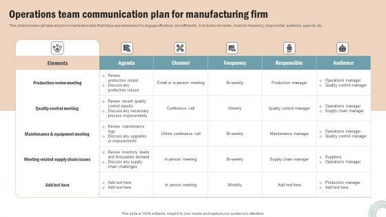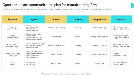 This slide provides glimpse about communication plan that helps operations team to engage effectively and efficiently. It includes elements, channel, frequency, responsible, audience, agenda, etc. From laying roadmaps to briefing everything in detail, our templates are perfect for you. You can set the stage with your presentation slides. All you have to do is download these easy to edit and customizable templates. Operations Team Communication Plan For Manufacturing Firm Diagrams PDF will help you deliver an outstanding performance that everyone would remember and praise you for. Do download this presentation today.