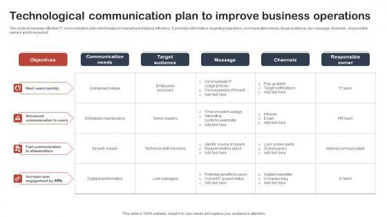 This slide showcases effective IT communication plan which helps in improving workplace efficiency. It provides information regarding objectives, communication needs, target audience, key message, channels , responsible owners and time period. Showcasing this set of slides titled Technological Communication Plan To Improve Business Operations Designs Pdf. The topics addressed in these templates are Communication needs, Target audience, Message. All the content presented in this PPT design is completely editable. Download it and make adjustments in color, background, font etc. as per your unique business setting. This slide showcases effective IT communication plan which helps in improving workplace efficiency. It provides information regarding objectives, communication needs, target audience, key message, channels , responsible owners and time period.