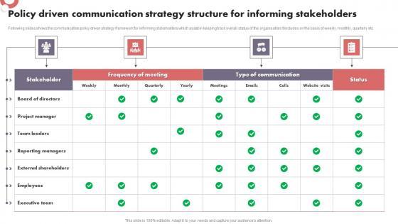 Following slides shows the communication policy driven strategy framework for informing stakeholders which assist in keeping track overall status of the orgainsation.It includes on the basis of weekly, monthly, quarterly etc Showcasing this set of slides titled Policy Driven Communication Strategy Structure For Informing Stakeholders Pictures Pdf The topics addressed in these templates are Stakeholder, Frequency Of Meeting, Communication All the content presented in this PPT design is completely editable. Download it and make adjustments in color, background, font etc. as per your unique business setting. Following slides shows the communication policy driven strategy framework for informing stakeholders which assist in keeping track overall status of the orgainsation.It includes on the basis of weekly, monthly, quarterly etc