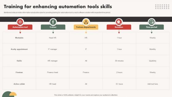 Mentioned slide provides information about action plan for providing training for automation tool by each software solution with respective time period. Do you know about Slidesgeeks Automated Communication System Training For Enhancing Automation Tools Skills These are perfect for delivering any kind od presentation. Using it, create PowerPoint presentations that communicate your ideas and engage audiences. Save time and effort by using our pre-designed presentation templates that are perfect for a wide range of topic. Our vast selection of designs covers a range of styles, from creative to business, and are all highly customizable and easy to edit. Download as a PowerPoint template or use them as Google Slides themes. Mentioned slide provides information about action plan for providing training for automation tool by each software solution with respective time period.