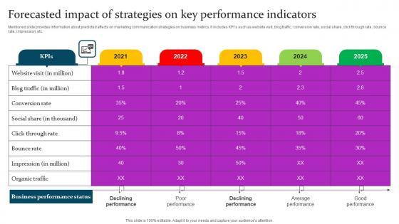 Mentioned slide provides information about predicted affects on marketing communication strategies on business metrics. It includes KPIs such as website visit, blog traffic, conversion rate, social share, click through rate, bounce rate, impression, etc. Whether you have daily or monthly meetings, a brilliant presentation is necessary. Forecasted Impact Of Strategies On Deployment Of Marketing Communication Portrait Pdf can be your best option for delivering a presentation. Represent everything in detail using Forecasted Impact Of Strategies On Deployment Of Marketing Communication Portrait Pdf and make yourself stand out in meetings. The template is versatile and follows a structure that will cater to your requirements. All the templates prepared by Slidegeeks are easy to download and edit. Our research experts have taken care of the corporate themes as well. So, give it a try and see the results. Mentioned slide provides information about predicted affects on marketing communication strategies on business metrics. It includes KPIs such as website visit, blog traffic, conversion rate, social share, click through rate, bounce rate, impression, etc.