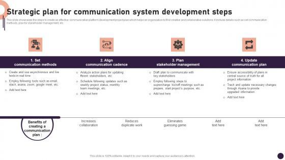 This slide showcases the steps to create an effective communication platform development project plan which helps an organization to find creative and collaborative solutions. It include details such as set communication methods, plan for stakeholder management, etc. Pitch your topic with ease and precision using this Strategic Plan For Communication System Development Steps Topics Pdf. This layout presents information on Align Communication Cadence, Plan Stakeholder Management, Update Communication Plan. It is also available for immediate download and adjustment. So, changes can be made in the color, design, graphics or any other component to create a unique layout. This slide showcases the steps to create an effective communication platform development project plan which helps an organization to find creative and collaborative solutions. It include details such as set communication methods, plan for stakeholder management, etc.