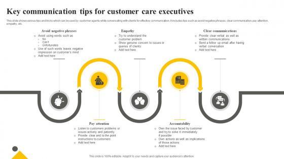 This slide shows various tips and tricks which can be used by customer agents while conversating with clients for effective communication. It includes tips such as avoid negative phrases, clear communication, pay attention, empathy, etc. Present like a pro with Client Support Plan To Increase Customer Key Communication Tips For Customer Care Executives Strategy SS V. Create beautiful presentations together with your team, using our easy-to-use presentation slides. Share your ideas in real-time and make changes on the fly by downloading our templates. So whether you are in the office, on the go, or in a remote location, you can stay in sync with your team and present your ideas with confidence. With Slidegeeks presentation got a whole lot easier. Grab these presentations today. This slide shows various tips and tricks which can be used by customer agents while conversating with clients for effective communication. It includes tips such as avoid negative phrases, clear communication, pay attention, empathy, etc.