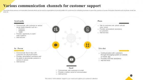 This slide shows various communication channels which can be used by organizations to provide platform to customers for contacting business in case of any queries or issues. It includes channels such as phone, email, live chat, etc. Find a pre-designed and impeccable Client Support Plan To Increase Customer Various Communication Channels For Customer Strategy SS V. The templates can ace your presentation without additional effort. You can download these easy-to-edit presentation templates to make your presentation stand out from others. So, what are you waiting for Download the template from Slidegeeks today and give a unique touch to your presentation. This slide shows various communication channels which can be used by organizations to provide platform to customers for contacting business in case of any queries or issues. It includes channels such as phone, email, live chat, etc.