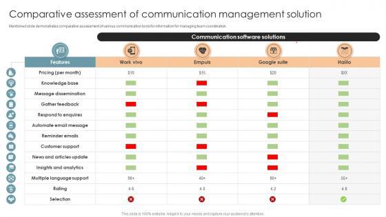 Mentioned slide demonstrates comparative assessment of various communication tools for information for managing team coordination.Do you have an important presentation coming up Are you looking for something that will make your presentation stand out from the rest Look no further than Comparative Assessment Of Communication Office Process Optimization To Increase Cost Efficiency. With our professional designs, you can trust that your presentation will pop and make delivering it a smooth process. And with Slidegeeks, you can trust that your presentation will be unique and memorable. So why wait Grab Comparative Assessment Of Communication Office Process Optimization To Increase Cost Efficiency today and make your presentation stand out from the rest Mentioned slide demonstrates comparative assessment of various communication tools for information for managing team coordination.