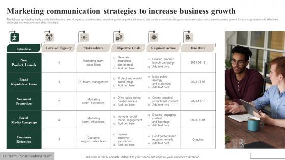 The following slide highlights points like situation, level of urgency, stakeholders, objective goals, required action and due date to show marketing communication plan to increase business growth. It helps organizations to effectively strategize and execute marketing initiatives Showcasing this set of slides titled Marketing Communication Strategies To Increase Business Growth Microsoft Pdf The topics addressed in these templates are Product Launch, Seasonal Promotion, Customer Retention All the content presented in this PPT design is completely editable. Download it and make adjustments in color, background, font etc. as per your unique business setting. The following slide highlights points like situation, level of urgency, stakeholders, objective goals, required action and due date to show marketing communication plan to increase business growth. It helps organizations to effectively strategize and execute marketing initiatives
