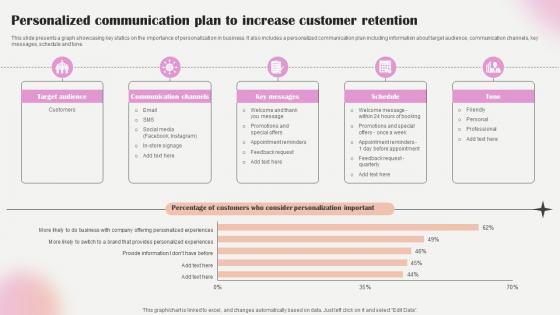 This slide presents a graph showcasing key statics on the importance of personalization in business. It also includes a personalized communication plan including information about target audience, communication channels, key messages, schedule and tone. If you are looking for a format to display your unique thoughts, then the professionally designed Customizing The Salon Experience Personalized Communication Plan To Increase Customer Strategy SS V is the one for you. You can use it as a Google Slides template or a PowerPoint template. Incorporate impressive visuals, symbols, images, and other charts. Modify or reorganize the text boxes as you desire. Experiment with shade schemes and font pairings. Alter, share or cooperate with other people on your work. Download Customizing The Salon Experience Personalized Communication Plan To Increase Customer Strategy SS V and find out how to give a successful presentation. Present a perfect display to your team and make your presentation unforgettable. This slide presents a graph showcasing key statics on the importance of personalization in business. It also includes a personalized communication plan including information about target audience, communication channels, key messages, schedule and tone.