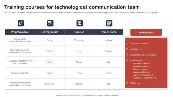 This slide represents training program for technical communications team which helps improve staff skill set. It provides information regarding program name, delivery mode, duration, trainer name and key highlights. Pitch your topic with ease and precision using this Training Courses For Technological Communication Team Slides Pdf. This layout presents information on Communication Team, Key Highlights, Weeks. It is also available for immediate download and adjustment. So, changes can be made in the color, design, graphics or any other component to create a unique layout. This slide represents training program for technical communications team which helps improve staff skill set. It provides information regarding program name, delivery mode, duration, trainer name and key highlights.