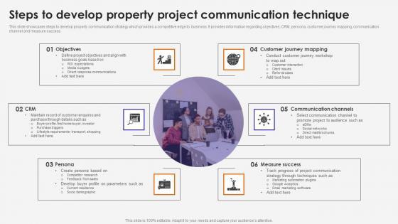 This slide showcases steps to develop property communication strategy which provides a competitive edge to business. It provides information regarding objectives, CRM, persona, customer journey mapping, communication channel and measure success. Pitch your topic with ease and precision using this Steps To Develop Property Project Communication Technique Topics Pdf. This layout presents information on Objectives, Customer Journey Mapping, Persona. It is also available for immediate download and adjustment. So, changes can be made in the color, design, graphics or any other component to create a unique layout. This slide showcases steps to develop property communication strategy which provides a competitive edge to business. It provides information regarding objectives, CRM, persona, customer journey mapping, communication channel and measure success.