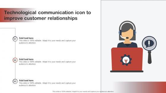 Showcasing this set of slides titled Technological Communication Icon To Improve Customer Relationships Infographics Pdf. The topics addressed in these templates are Technological Communication, Improve, Customer Relationships. All the content presented in this PPT design is completely editable. Download it and make adjustments in color, background, font etc. as per your unique business setting. Our Technological Communication Icon To Improve Customer Relationships Infographics Pdf are topically designed to provide an attractive backdrop to any subject. Use them to look like a presentation pro.