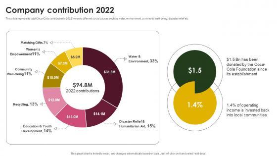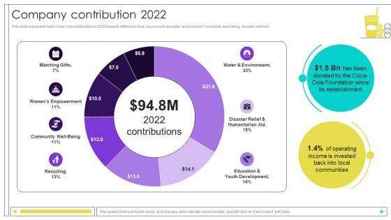 This slide represents total Coca-Cola contribution in 2022 towards different social causes such as water, environment, community well-being, disaster relief etc.There are so many reasons you need a Company Contribution 2022 Beverage Company Profile CP SS V. The first reason is you can not spend time making everything from scratch, Thus, Slidegeeks has made presentation templates for you too. You can easily download these templates from our website easily. This slide represents total Coca-Cola contribution in 2022 towards different social causes such as water, environment, community well-being, disaster relief etc.