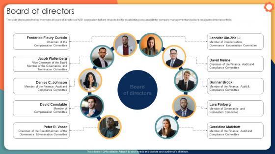 The slide showcases the key members of board of directors of ABB corporation that are responsible for establishing accountability for company management and assure reasonable internal controls. Create an editable Board Of Directors Engineering Solution Provider Company Profile CP SS V that communicates your idea and engages your audience. Whether you are presenting a business or an educational presentation, pre-designed presentation templates help save time. Board Of Directors Engineering Solution Provider Company Profile CP SS V is highly customizable and very easy to edit, covering many different styles from creative to business presentations. Slidegeeks has creative team members who have crafted amazing templates. So, go and get them without any delay. The slide showcases the key members of board of directors of ABB corporation that are responsible for establishing accountability for company management and assure reasonable internal controls.