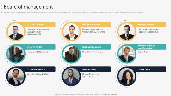 Mentioned slide provides information about company team members in board od management. It includes the chairman, finance and operations officer, integrity and legal affairs, board member China, etc.Boost your pitch with our creative Board Of Management Automobile Development Company Profile CP SS V. Deliver an awe-inspiring pitch that will mesmerize everyone. Using these presentation templates you will surely catch everyones attention. You can browse the ppts collection on our website. We have researchers who are experts at creating the right content for the templates. So you do not have to invest time in any additional work. Just grab the template now and use them. Mentioned slide provides information about company team members in board od management. It includes the chairman, finance and operations officer, integrity and legal affairs, board member China, etc.