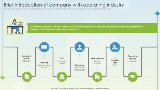 This slide mentions the company overview containing details such as company name, website, CEO, founders, headquarters, founded year, and operating industry such as software. Create an editable Brief Introduction Of Company With Operating Industry Business Growth Ppt Example that communicates your idea and engages your audience. Whether you are presenting a business or an educational presentation, pre-designed presentation templates help save time. Brief Introduction Of Company With Operating Industry Business Growth Ppt Example is highly customizable and very easy to edit, covering many different styles from creative to business presentations. Slidegeeks has creative team members who have crafted amazing templates. So, go and get them without any delay. This slide mentions the company overview containing details such as company name, website, CEO, founders, headquarters, founded year, and operating industry such as software.