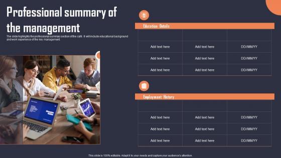The slide highlights the professional summary section of the cafe. It will include educational background and work experience of the key management. If your project calls for a presentation, then Slidegeeks is your go-to partner because we have professionally designed, easy-to-edit templates that are perfect for any presentation. After downloading, you can easily edit Professional Summary Of The Management Building An Insurance Company Icons Pdf and make the changes accordingly. You can rearrange slides or fill them with different images. Check out all the handy templates The slide highlights the professional summary section of the cafe. It will include educational background and work experience of the key management.